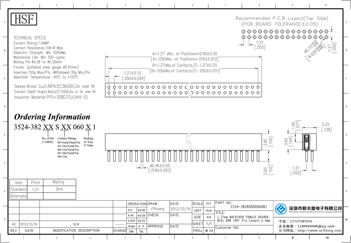 產品分類:圓孔排針排母連接器 產品型號:聯豐盈 1.27MM 雙排2*29P 直插 塑膠高度3.8 圓孔排母連接器 技術參數:額定電流:1.0amp接觸電阻:10m0 Max Dielectric強度:MIN 500vrm5機械壽命:最少