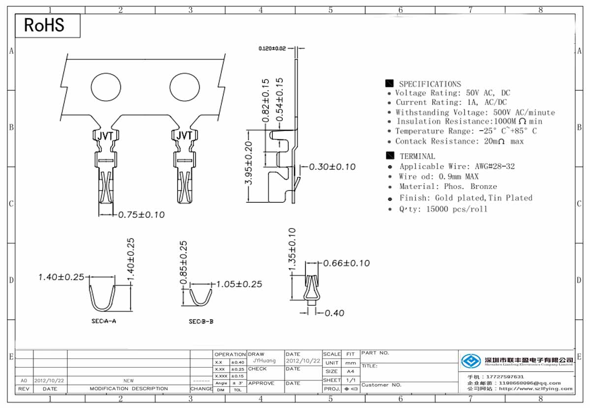 - 端子(Terminal):Phosphor Bronze ,Tin/Gold plated