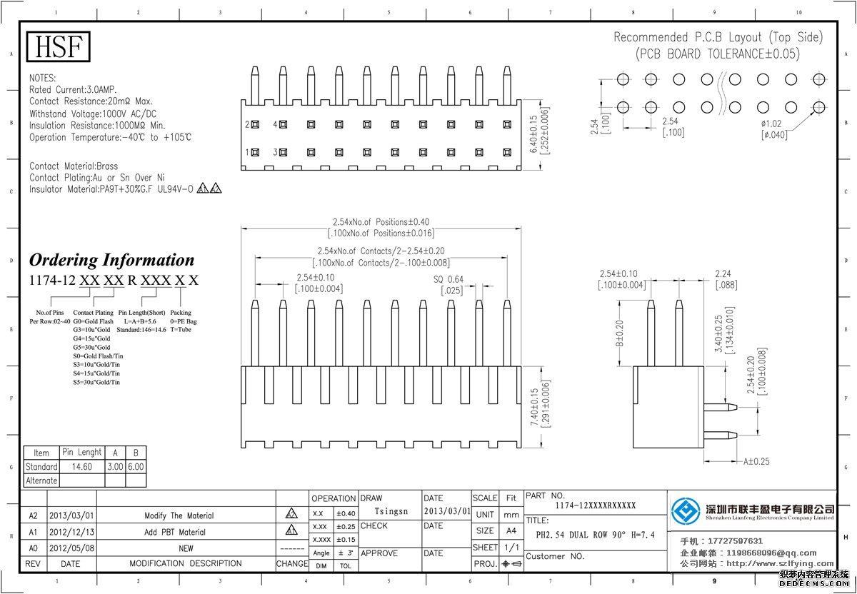 技術參數:額定電流:3.0amp電流電阻:20mΩ最大絕緣電阻:1000mΩ承受電壓:AC 500V /分鐘工作溫度:40﹣℃+ 105℃接觸材料:黃銅觸點電鍍金或錫鎳絕緣體材質:聚酯(UL94V-0)標準:PA9T或PBT黑色+ 30% GF